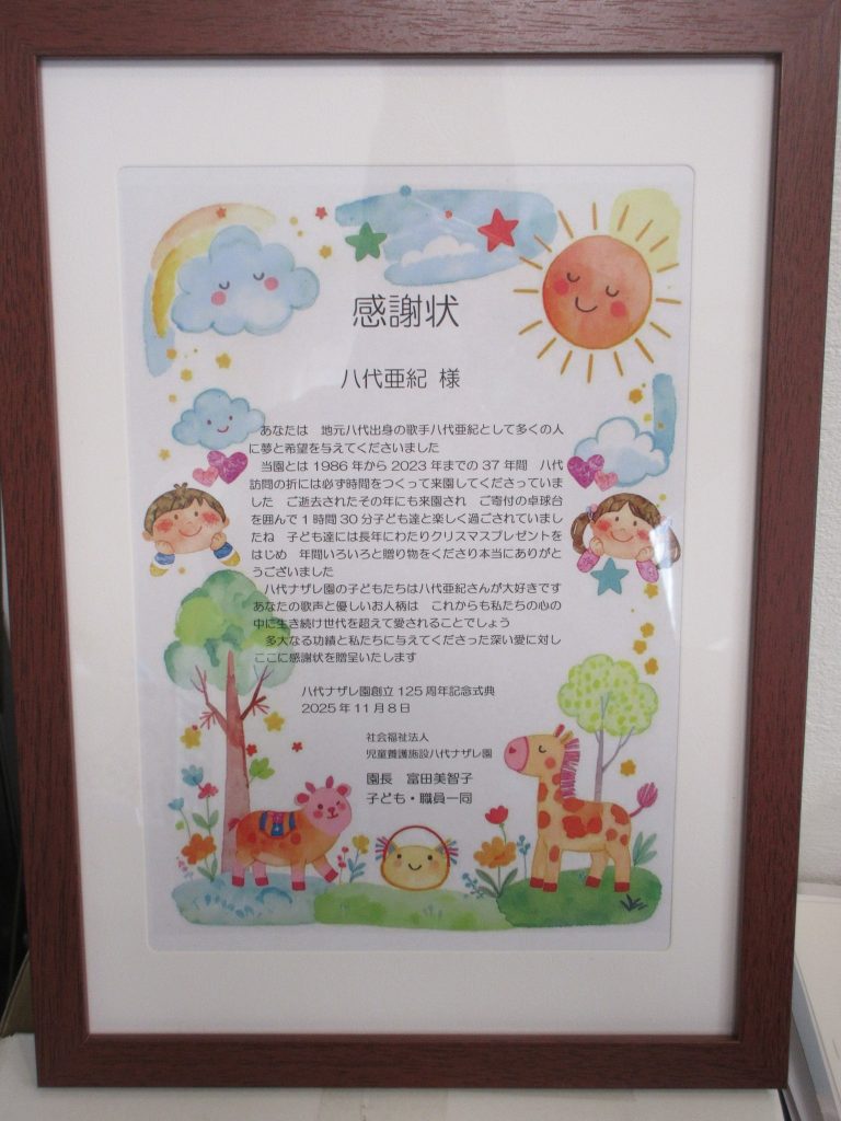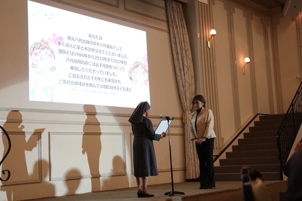 最後に、園長からの「謝辞」としてマイクを持ち「本来ならば、会場の皆様お一人お一人にもお渡ししなければならないのですが、そこは叶いませんので代表として『八代亜紀様』に感謝状を授与致します。」と言い、当園との関わりが37年間の八代亜紀さんへの感謝状を代理の、八代亜紀さんのいとこの大木和美さん(八代在住)へ授与致しました。